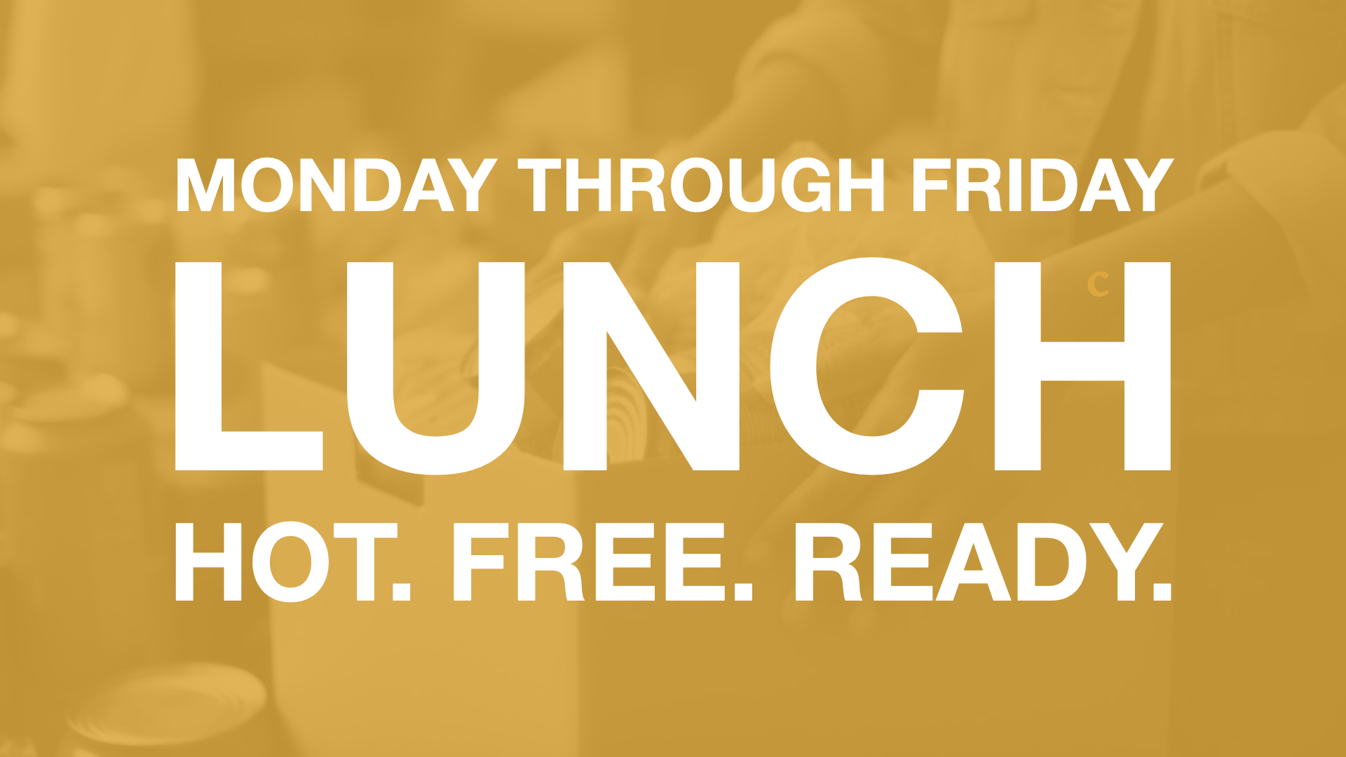 Join us every weekday (Monday through Friday) at 11 AM for free hot food, prepared for takeaway through our partnership with Bethesda Cares.
